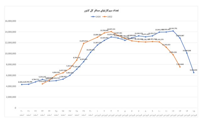 ستاد سفر اعلام کرد از ۲۵ اسفند ۱۴۰۳ تا ۱۵ فروردینماه امسال، ۳۶ میلیون و ۵۱۹ هزار و ۶۷۱ نفر سفر رفتند و ۶۰ میلیون و ۹۷۰ هزار و ۵۲۳ نفر شب اقامت ثبت شده است. بشترین سفرها در مازندران، گیلان، خراسان رضوی، تهران و اصفهان انجام شده است.